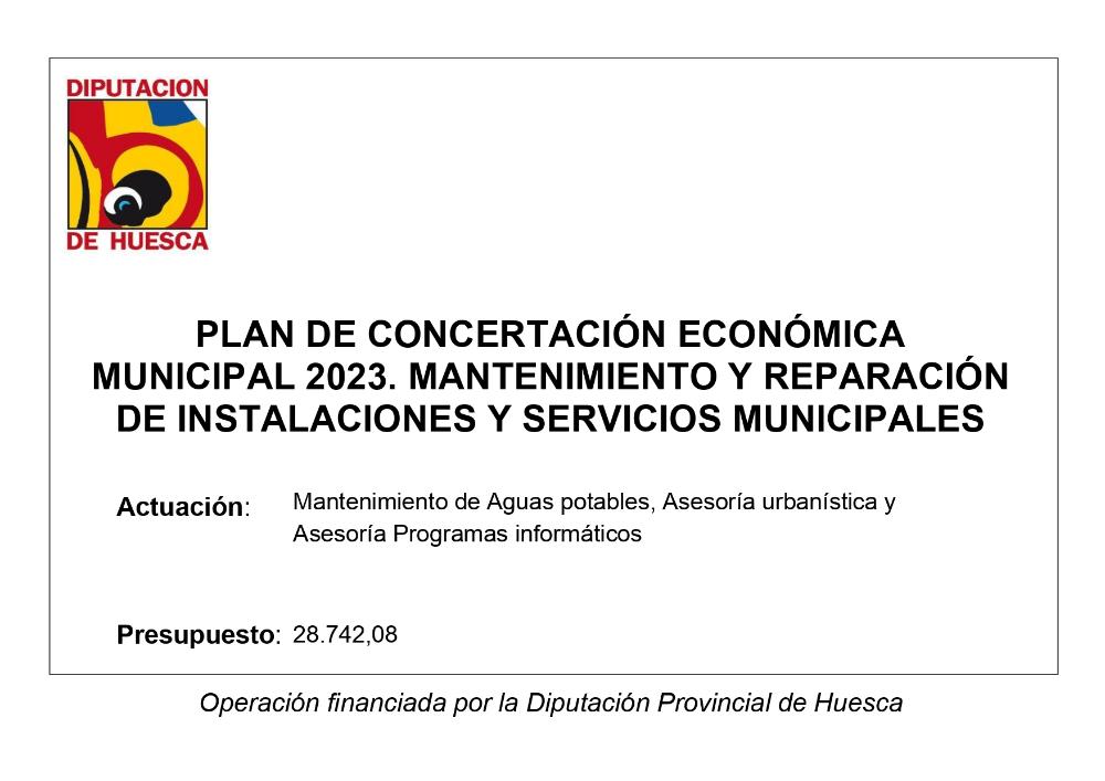 La Diputación Provincial de Huesca ha financiado los Servicios de Mantenimiento de Aguas potables del municipio, así como los Servicios de Asesoría Urbanística y Asesoría y mantenimiento de programas informáticos durante el año 2023, con un importe de subvención de 28.742,08 €